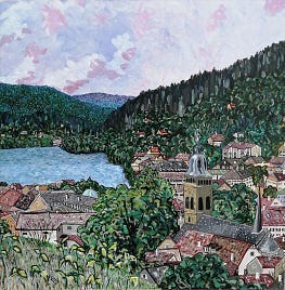 This is a large 1m square painting I made about four years ago. It’s a view of the town from la Roche du Rain on a lovely summer day. This viewpoint was our go to dog-walk when we used to live on that side of the town. Now it’s a bit too far, but we have found many others lovely spots from which to enjoy a good view.