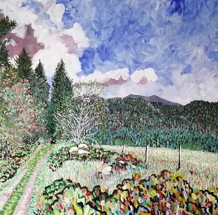 Here’s the post that got lost yesterday! This is an easy path which provides amazing views, but I decided to take a photo and then paint it on the way back. Here we have a meadow on the right side, some hazel and birch trees on the left and in the background the forested mounds of the Vosges. For those into geography the path runs from Le Grovelin to the Roches de Bioquet in the town of La Bresse. thanks! Ivan