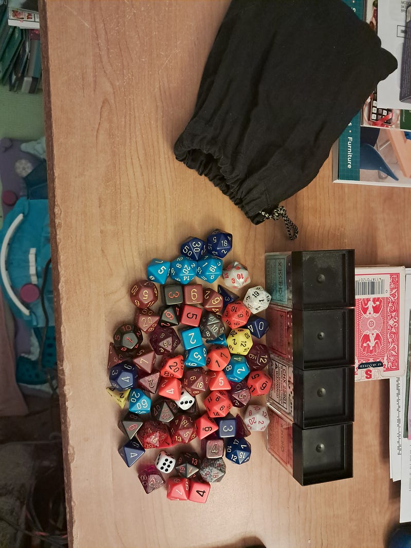 Here are my dice that I found while spring cleaning. Mostly Chessex dice. But they look nice and are affordable. Still beaming by rediscovering my dice.