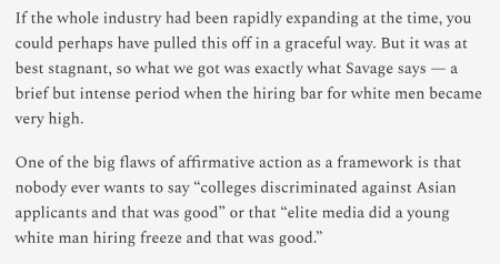 Interesting if counterfactual contention from Matthew Yglesias about the mega-viral Jacob Savage article in Compact Magazine that career-stunting discrimination against white men took place only over a “brief but intense period.” The reality is that the period of maximum intensity was arguably somewhat brief, but that the slow-boil determination to kneecap that particular demographic dates back decades, depending on the field, and continues unabated today.