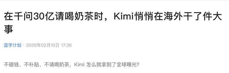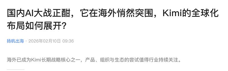 Kimi is clearly pushing a global expansion narrative. But two Chinese-language articles—one with fewer than 500 reads—won’t move that story forward. The real signal is elsewhere: even in a very Kimi-friendly piece, Kimi explicitly draws a line away from Manus’ China-shedding template. The first piece differentiates how Kimi is different and choosing a broader path—Agent subscriptions, APIs, open models, and developer ecosystems in parallel. Kimi is deliberately resisting that framing that Manus' way is the only way to go.