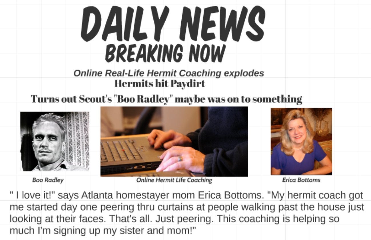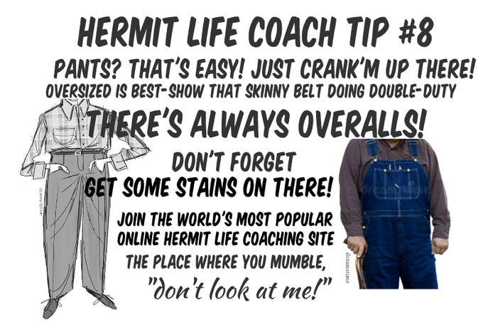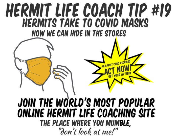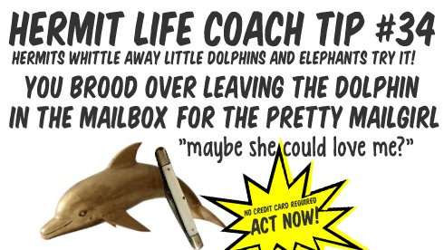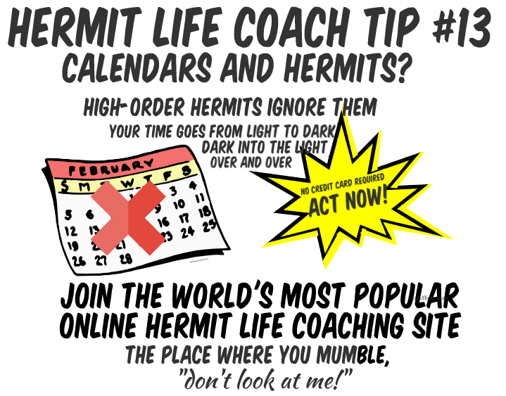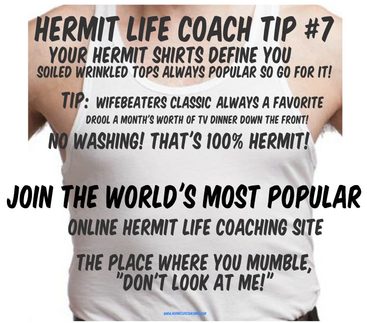 during the plague (that's what i call it) i created a ficticious online hermit life coaching website. a “high-order” hermit would guide subscribing hermit wanabees. for several months, i ran with internet ads for the online hermit life coaching site, posting weekly life coaching hermit tips. truth: i am that high-order hermit! zen hermit. here's (6 ) of the weekly hermit tips! Take a look, have a laugh.
