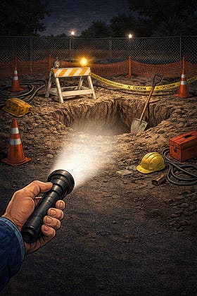 And then we realized something else. Construction zone. Which, in the dark, is less of a zone and more of a suggestion.