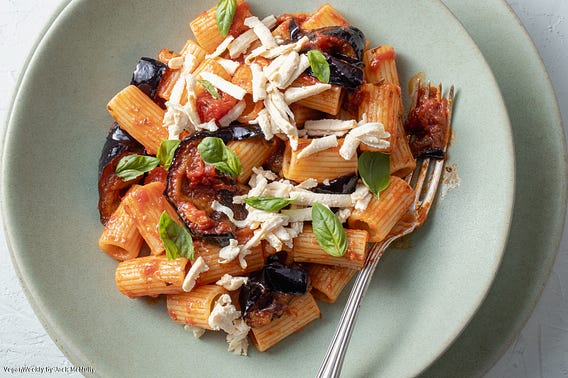 Pasta Norma made in the traditional manner with rigatoni, tomato sauce, generous pieces of eggplant, topped with basil, and the only non-traditional aspect - my tofu salata to replace ricotta salata…