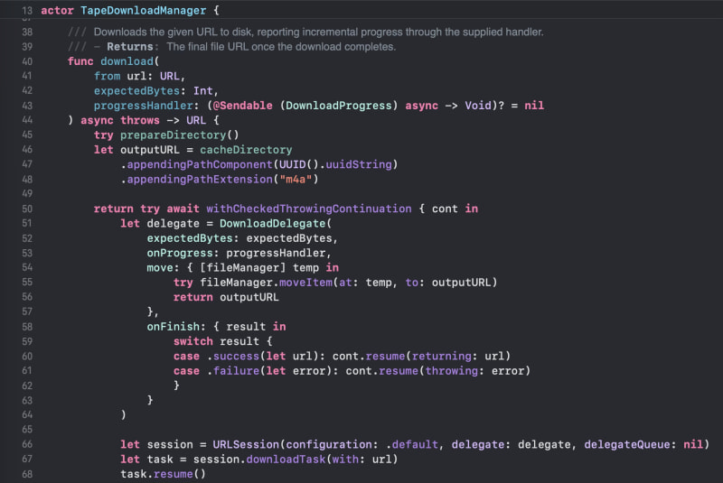 We also have a TapeDownloadManager that streams the tape data from the URL, writes it to a file, and returns the final file URL so we can play it.