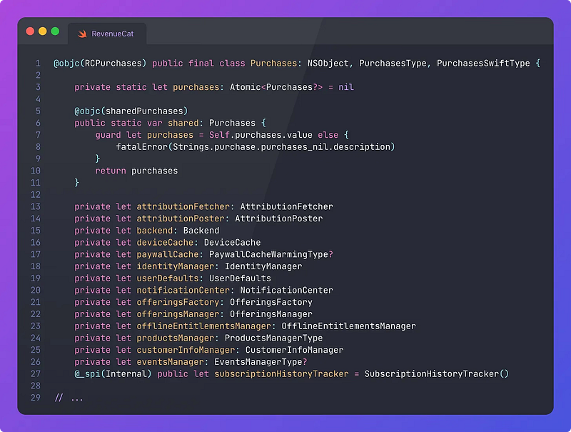 Purchases, the main object devs use to init and use the SDK, is this façade, a minimal developer-friendly API that distills the tasks of complex StoreKit integration, receipt validation, and entitlement management into a few simple function calls.