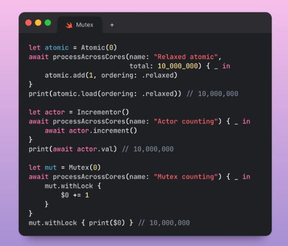 Performance between Actors and Atomics were pretty close . The real standout here was Mutex blowing the other two approaches out of the water, counting to 10m in less than half the time of the others.