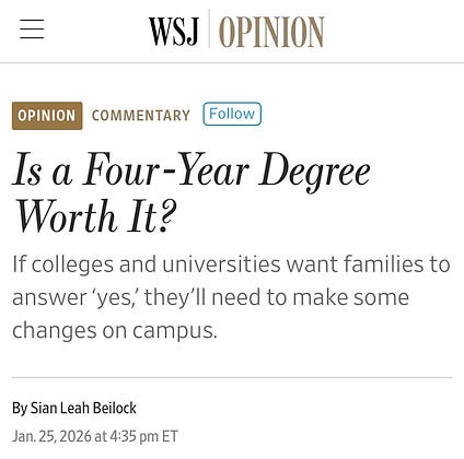 Sian Beilock, the President of Dartmouth, just wrote an op-ed in the Wall Street Journal calling to "re-center higher education on learning rather than political posturing" and to "emphasize equal opportunity, not equal outcomes."