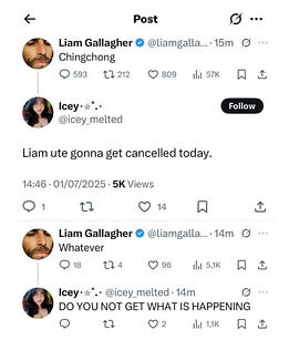 Liam Gallagher is pushing 53 and certainly old enough to know that chingchong is not a compliment. Between his doubling down (before finally giving a ‘sorry if you were offended’ apology) and his fanboys flipping & flopping between excuses — it isn’t a slur; only the Chinese should be offended; stop being so sensitive, bla bla bla — it’s just further proof that no one really gives a fuck about Asians.