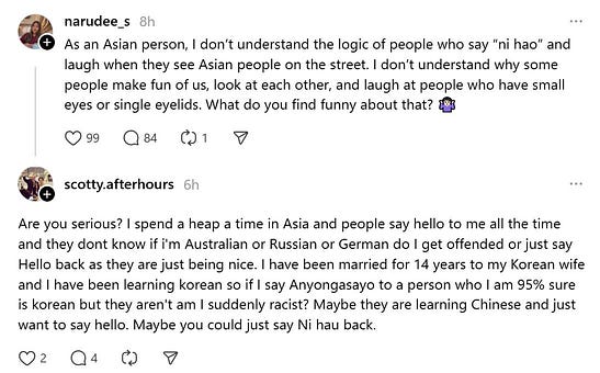 How did I know this was one of those "I'm married to an Asian woman" white guys, who has spent time in Asia (which he prob thinks is a country), so therefore he is qualified to invalidate the feelings of an actual Asian woman asking a genuine question about anti-Asian hate.