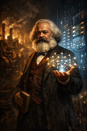 Hoy podría estar gestándose entre nosotros un nuevo Marx que trate de reconceptualizar la altura de nuestro tiempo, pues para muchos no estaríamos entrando en una nueva ola disruptiva de destrucción creativa propia de la innovación sino en una transformación de magnitud comparable a la que vivió Marx: si la inteligencia artificial llega a automatizar no solo tareas, sino la propia capacidad general de resolver problemas — creando esa crisis global de la inteligencia por su extrema abundancia — el trabajo humano podría dejar de ser el insumo central de la producción. En un mundo así, el control de infraestructuras cognitivas —modelos, datos, cómputo y plataformas— podría ocupar el lugar que los medios de producción tuvieron desde el siglo XIX y contra cuyos propietarios se llamó al levantamiento. Las tensiones sociales emergentes podrían volver a forzar un replanteamiento de las categorías del trabajo, del valor, de la plusvalía y de la propiedad. Y esta teoría pasar, una vez más, a la acción.