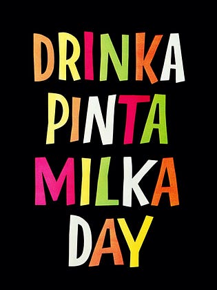 “Drinka pinta milka day,” a 1958 British slogan and iconic poster design created to boost milk sales, so effective it helped turn “pinta” into everyday slang and ran well into the 1970s.