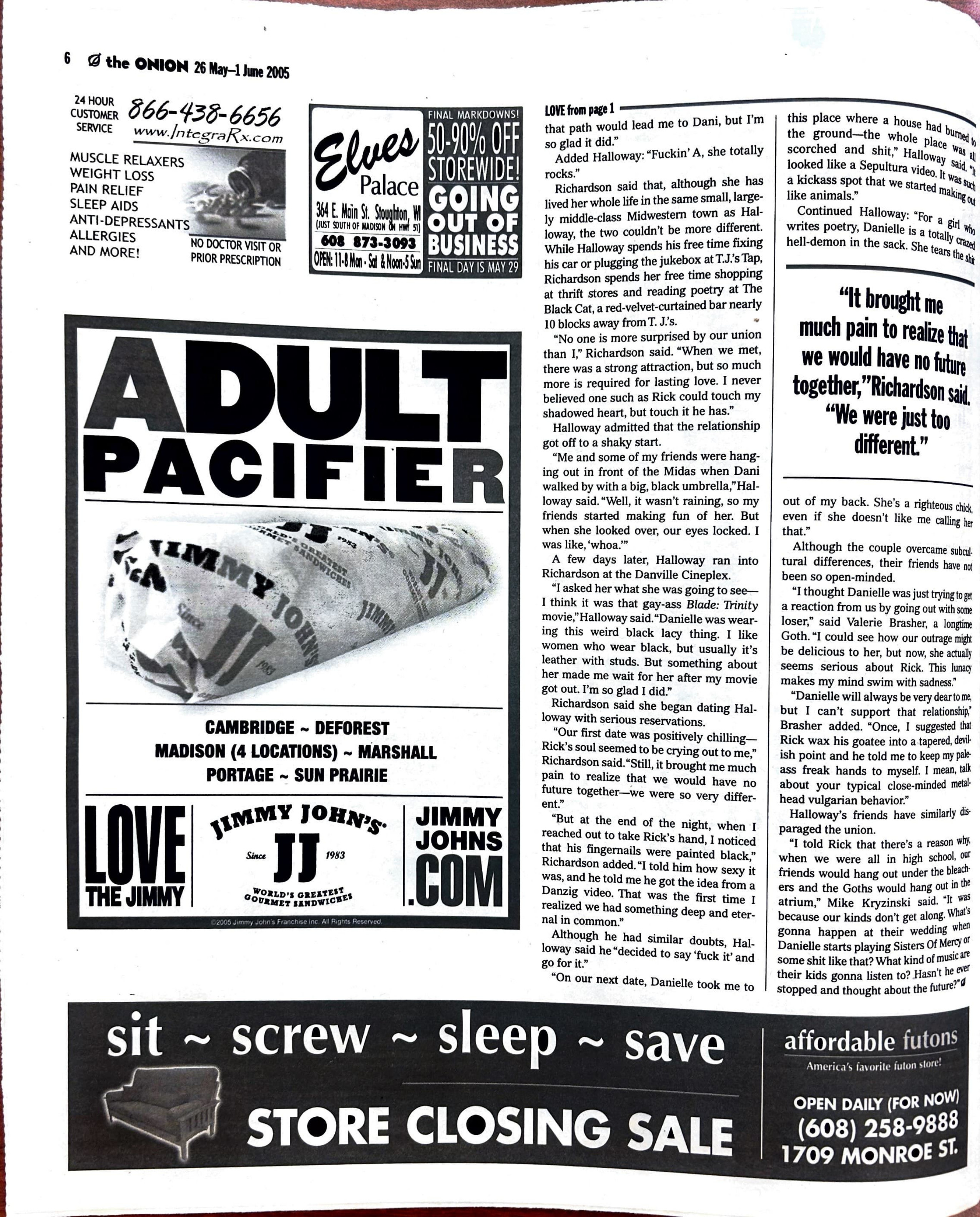 RIP to Elves Palace and Affordable Futons. Plus, the “ADULT PACIFIER” tagline for Jimmy Johns.