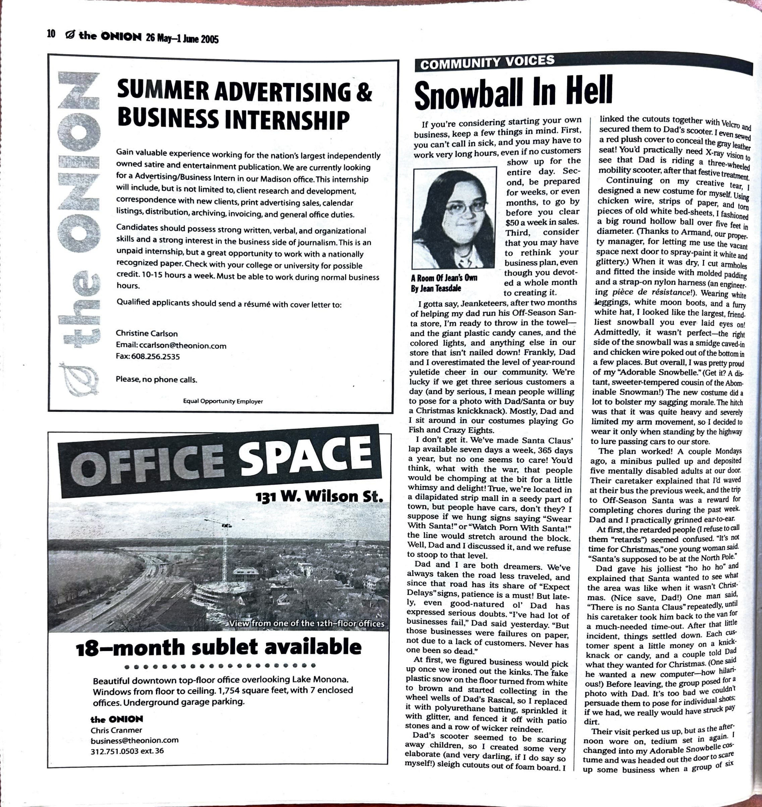 The Onion seeking an advertising and business intern for summer 2005 (another ad seeks a sales manager for the Madison, Wis., office).