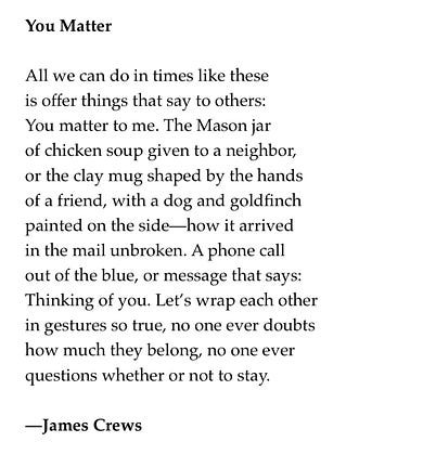 I’m so grateful that this poem of mine has been making its way around the internet lately, thanks to the many folks who have shared it. May we all take good care of each other during these times.