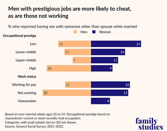 The group most likely to cheat on their spouse was not men in high prestige jobs (18%); it was women in low prestige jobs (21%).