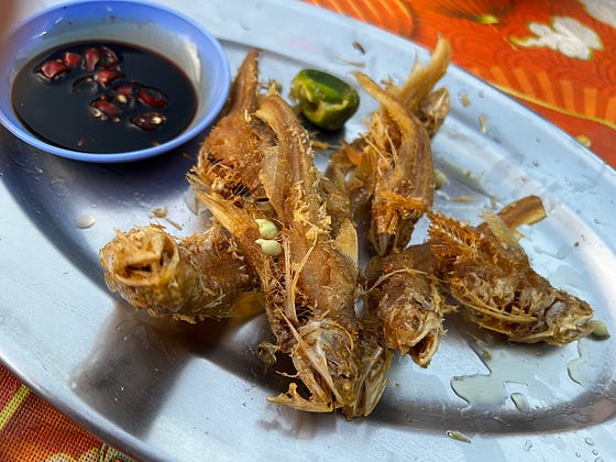 Silver whiting (not small anchovies or tiny whitebait, these are 3-5 inches long)—deep fried until you can crunch up the whole delicious fishes from head to tail—is this a thing in the West?