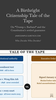 Ahead of Wednesday’s Supreme Court argument in the Birthright Citizenship case, I created a Tale of the Tape preview. If you like it, please share it (Who Decides Who Decides is completely free).