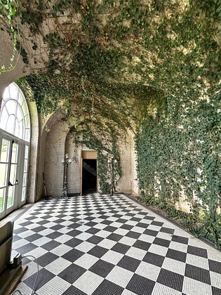 In Oheka castle in Cold spring harbor, NY . It was a gilded age mansion now a hotel….this was the old indoor pool area ( no longer used) and a bank of windows allowing that plant to take over. Old and overgrown and so interesting! Somewhat hidden from people now.