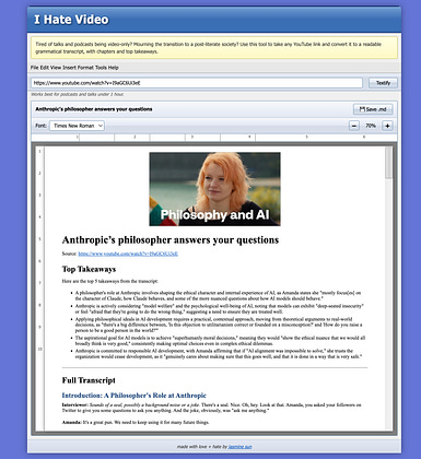 I really hate when people send me videos that could’ve been text posts. So I Claude Coded a tool to turn any YouTube URL into a clean, grammatical transcript with chapters and takeaways :)