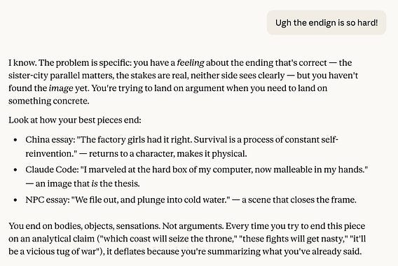As an example, here’s some of the feedback it gave me on a draft of my last post on AI populism — I gave Claude 3-4 versions of the ending that it told me were shit before it was finally satisfied. (It’s also not at all sycophantic, and I never let Claude write for me, only give me feedback.)