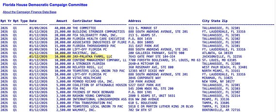 An example: Newly filed reports show that a fundraising committee led by the incoming House Democratic Leader (Rep. Christine Hunschofsky, D-Parkland) took $10,000 just before this year’s session began from the giant landowner that was behind the controversial “Blue Ribbon Projects” bill — the legislation that, had it passed, would enabled city-sized real-estate developments on rural tracts of land without any meaningful input from neighboring residents or local elected officials.