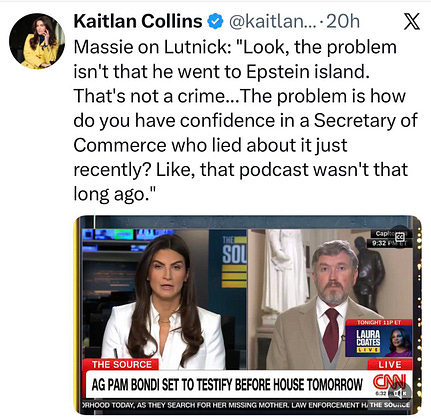 Anyone who uttered such a blatant lie about completely severing ties with Epstein, only to take his own family to the island and go into business with him years later, cannot be trusted in any position of government. Lutnick must resign.