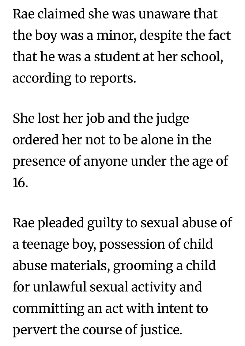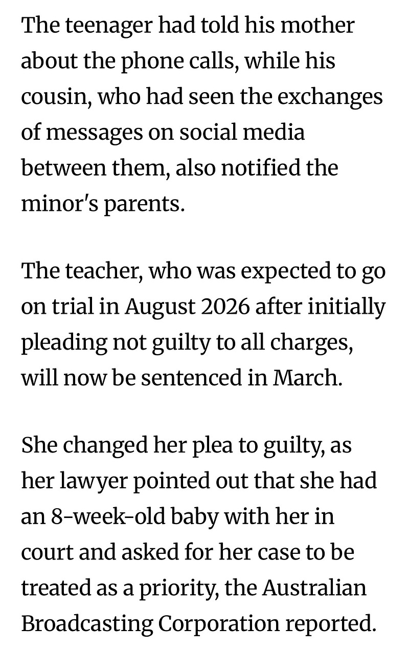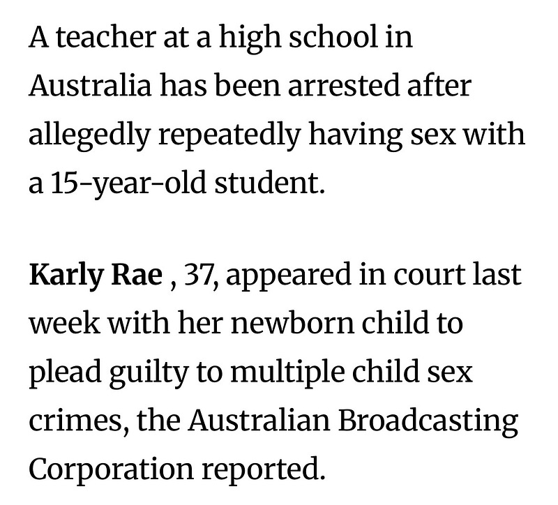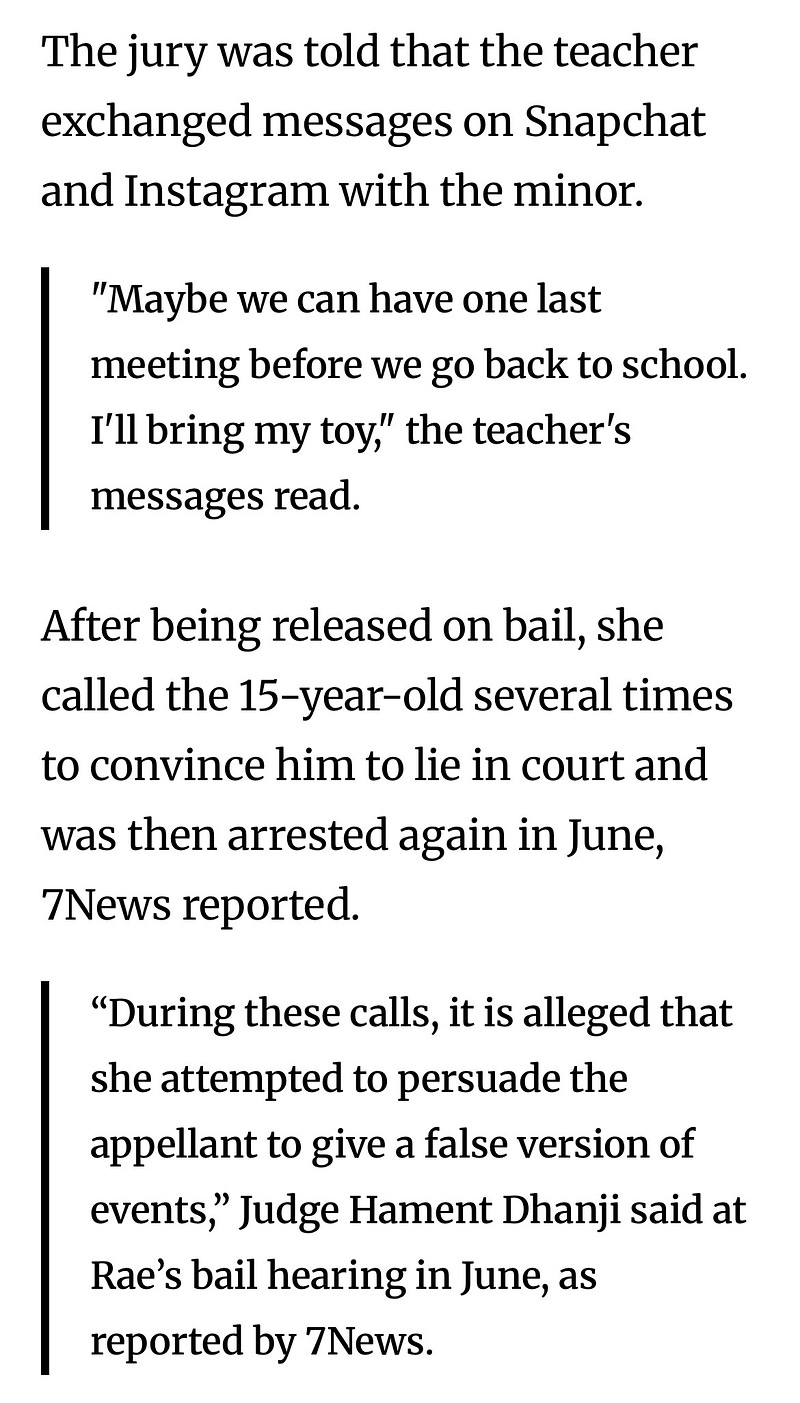 Aussie teacher, Karly Rae, age 37, was in sexual affair with a 15-year-old student, and pregnant. They’re not sure who the father is. She changed her plea to guilty, sentencing should happen this year. Her perverted texts shown below were discovered, additional charges for trying to get the boy to lie to investigators.