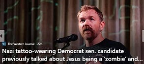 Nazi tattoo-wearing Democrat sen. candidate (Maine) and avowed atheist talked about Jesus being a 'zombie' and Mary a 'skank'.
