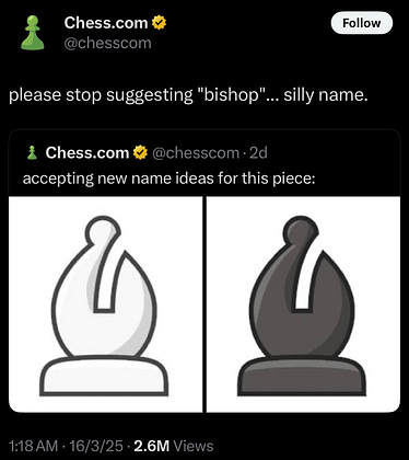 So, give some thought as to what you might rename the chess piece formerly known as Bishop, and let Chess. com know what your suggestion is. Just don’t be silly.