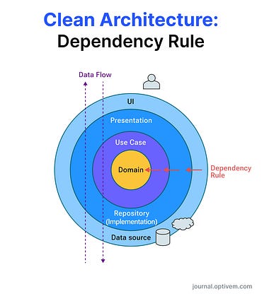 This means that inner layers (like your domain entities and use cases) should never depend on outer layers (like the UI, frameworks, or databases).