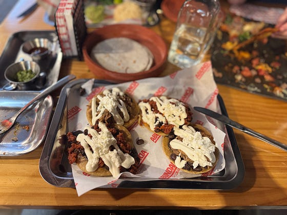 I’m always on the hunt for great Mexican food in Spain. It’s been hard to find at times, especially locally. But last night? I had the perfect margarita and sopes. 🍹 We absolutely destroyed the nachos we ordered as a starter. (You can peek that platter in the background.)