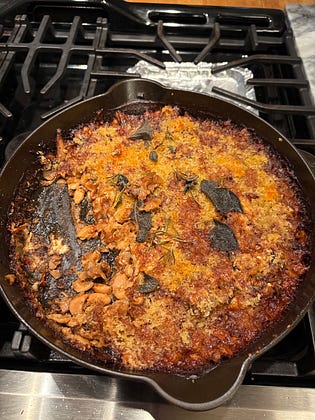 We have an arrangement where my husband cooks on Sundays. Jacques Pepin has been his long-time recipe source, but now Dave has discovered Alison Roman’s new book Something from Nothing (the beauty of having a wife with piles and piles of cookbooks). Yesterday he made the Crispy Baked Beans with Mushrooms and Parmesan and it was truly, truly delicious. (Possibly thanks to the 1 ½ cups of grated Parm in the recipe, but who am I to quibble with greatness?)
