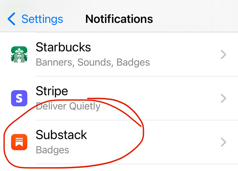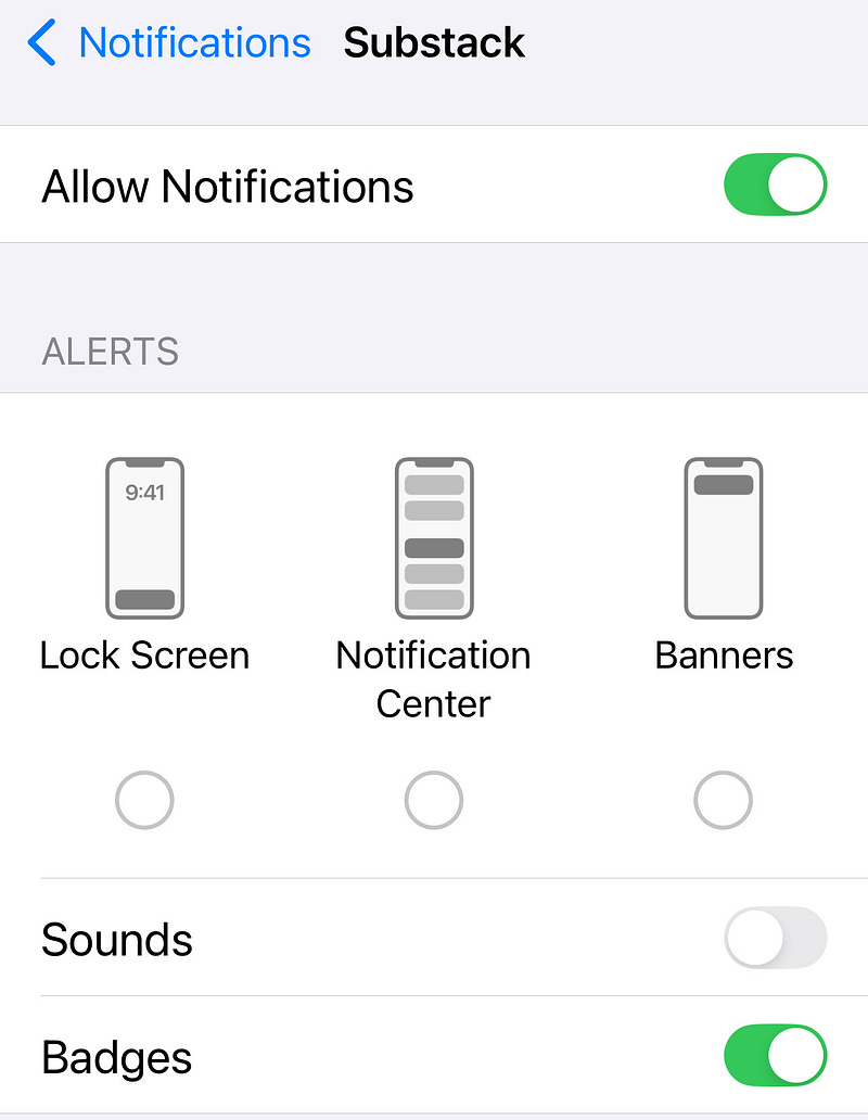 Go to SETTINGS → NOTIFICATIONS → and scroll down the list to the Substack app. From there you can select if/how notifications for that specific app are delivered.