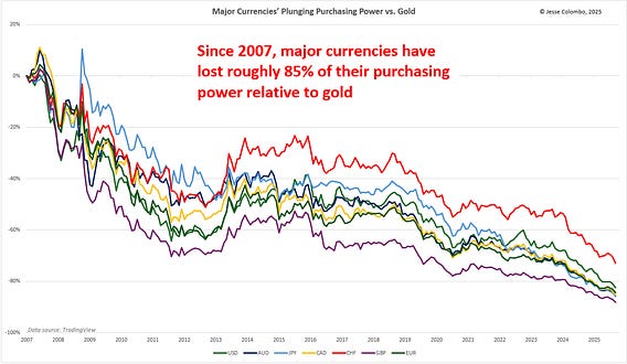 Since 2007, the major world currencies have lost 85% of their purchasing power when measured against gold.