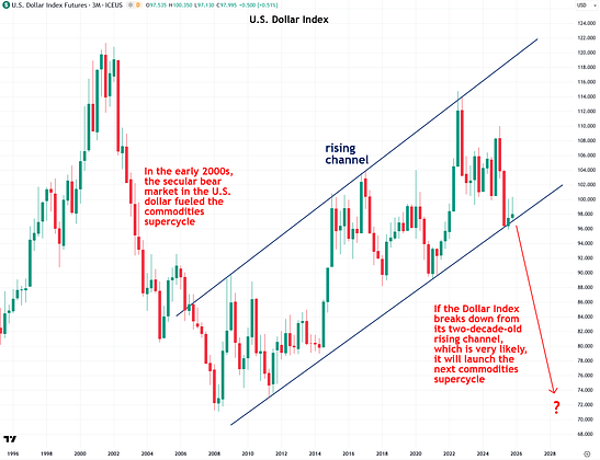 But there is a good chance that the dollar is about to break down from its channel and enter a secular bear market, launching the next decade-long commodities supercycle in an echo of the early 2000s.