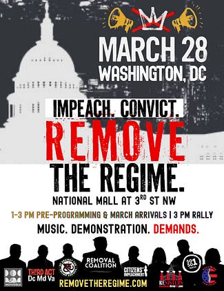 What is the world gonna hear from Americans on March 28?? It’s time to show them by the MILLIONS that we’re demanding Congress IMPEACH, CONVICT AND REMOVE THE REGIME!! Nowhere more so than at their doorstep in Washington, DC!