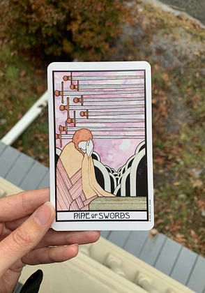 I wrote more on this, insomnia, grief & narrative in the newsletter this week. & Shout out to the Aquarian Tarot which is just so beautiful and is it just me or are the shapes behind the person (who appears to be suffering from insomnia) grave stones?
