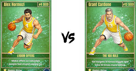 9 hours left in voting, I’m actually surprised Alex Hormozi ($100M Offers) is crushing Grant Cardone (The 10X Rule) in their matchups. I thought Cardone had lots of fans. It goes to show being loud and everywhere but shallow might not resonate with Substack people.