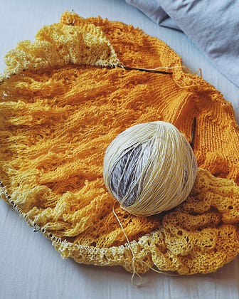The lace half-pi shawl has now entered the "yellow pile of spaghetti" phase of proceedings.