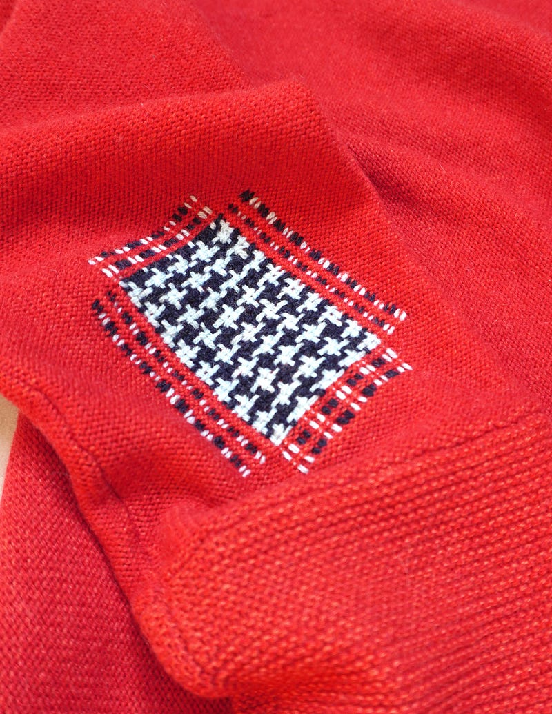 My camera refuses to show these aqua and navy yarns for the beautiful blues that they really are, but trust me when I say that they compliment this Eileen Fisher red jumper perfectly.