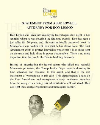Attorney for my colleague and friend Don Lemon has released a statement saying Don was arrested by federal agents in LA last night. This is outrageous and cannot stand. The First Amendment is under attack in America!