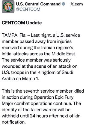 A seventh US service member has died during Trump‘s war of choice against Iran.