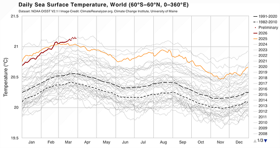 The Nino index (Nino3.4) has just reached Nino-neutral, but global SST (sea surface temperature) has matched the highest level for this date, which was achieved during the last El Nino.