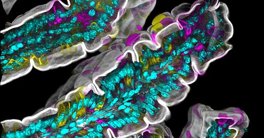 My featured artist this month is Rebecca Lee, whose lovely image of villi from the small intestines of mice is glowing below. Her photo was an honorable mention in the 2025 Photomicrography Competition from Nikon Small World (also featured in CAE 58), and I chose it among all the other wondrous images because the villi are a part of the body I know well since they are damaged by gluten when someone has celiac disease. It caught my eye, and I wrote to Rebecca asking if I could feature her.