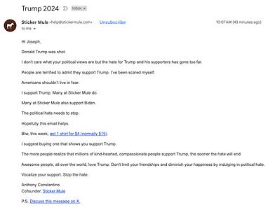 Sticker Mule's cofounder sends a bizarre email calling to end "anti-Trump hate." He then offers a discount on t-shirts and suggests buying one to "show support for Trump."