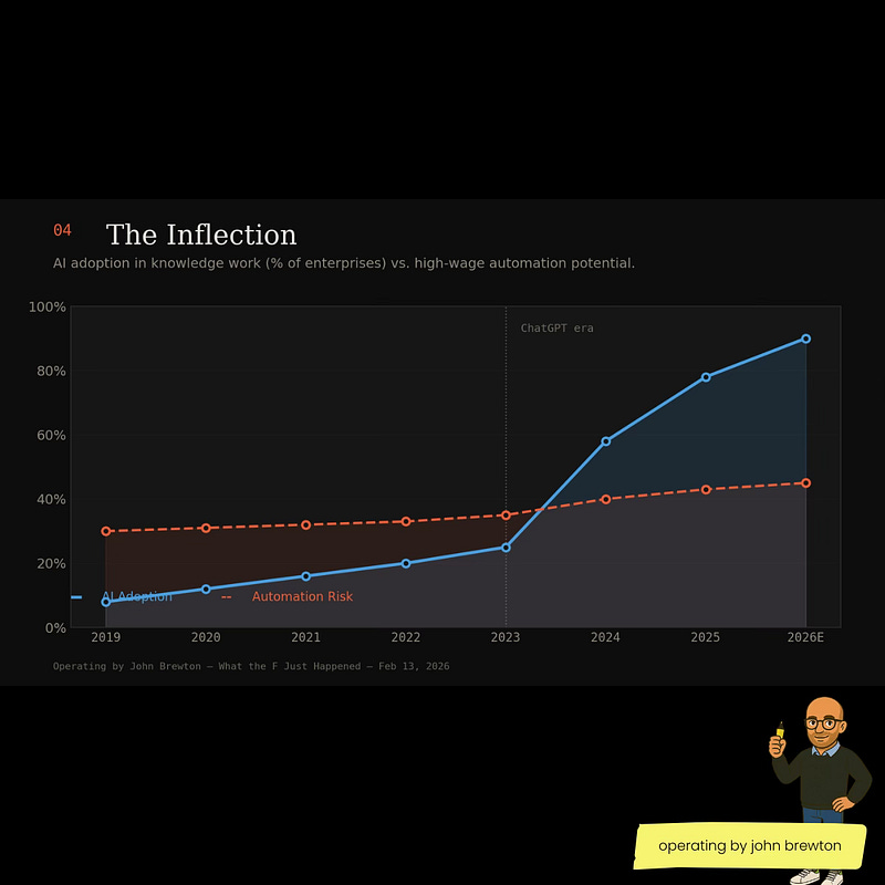 McKinsey now estimates AI could automate 45% of high-wage activities by 2030, up from 30% pre-2023. This mirrors the early 2010s industrial automation wave but at a faster clip and aimed squarely at white-collar work.