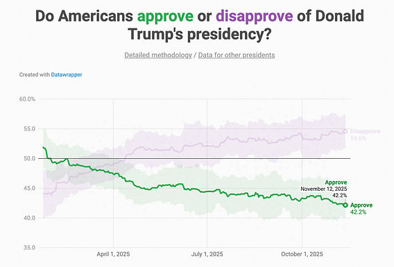 Trump’s second-term approval ratings hit a new low today, approaching 42%. His disapproval rate is over 12% higher than his approval.