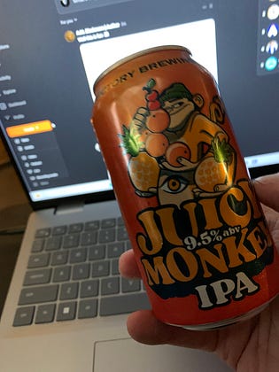 Good sweet Jiminy Christmas, I have not had a beer in a minute but my wife brought home a couple of cans from her last trip. We popped them open and I chugged mine, as I tend to always do with my first. I’m Scottish, it’s a thing. Was not aware of the alcohol content of this one. I am now thinking in color.