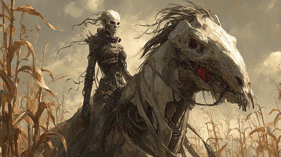 The rider steered his mount toward the crops, his pale eyes looking skyward, searching for the first signs of rain. They pressed forward, crops withering and dying in their wake.